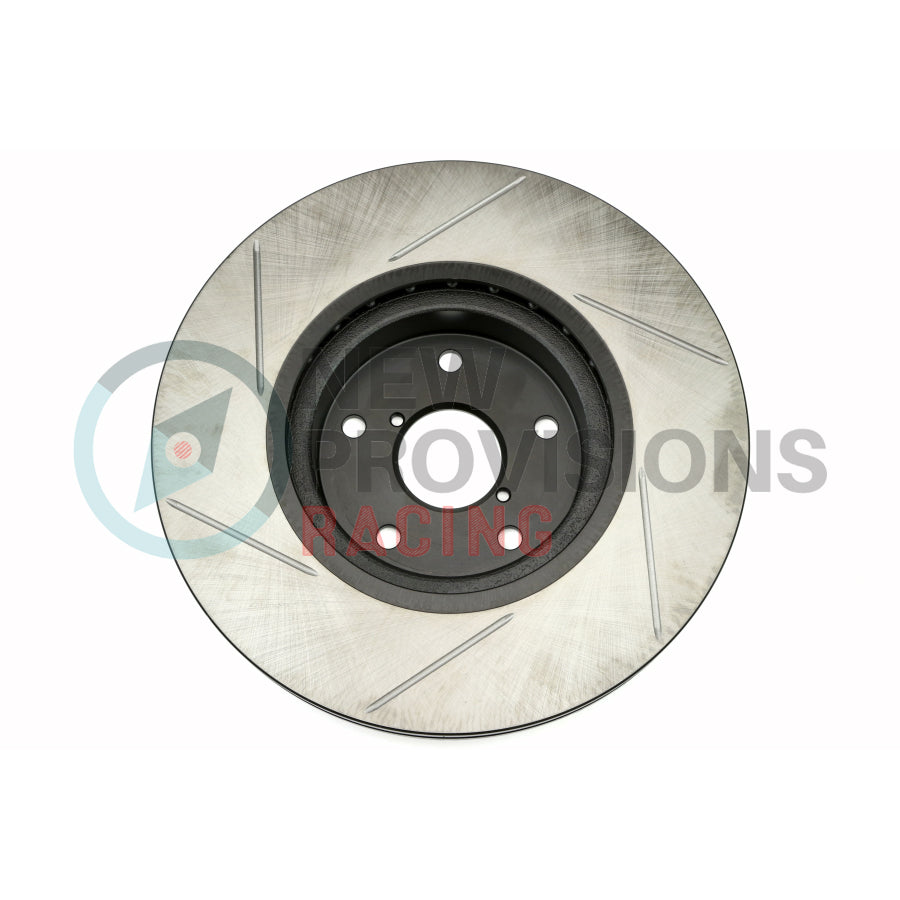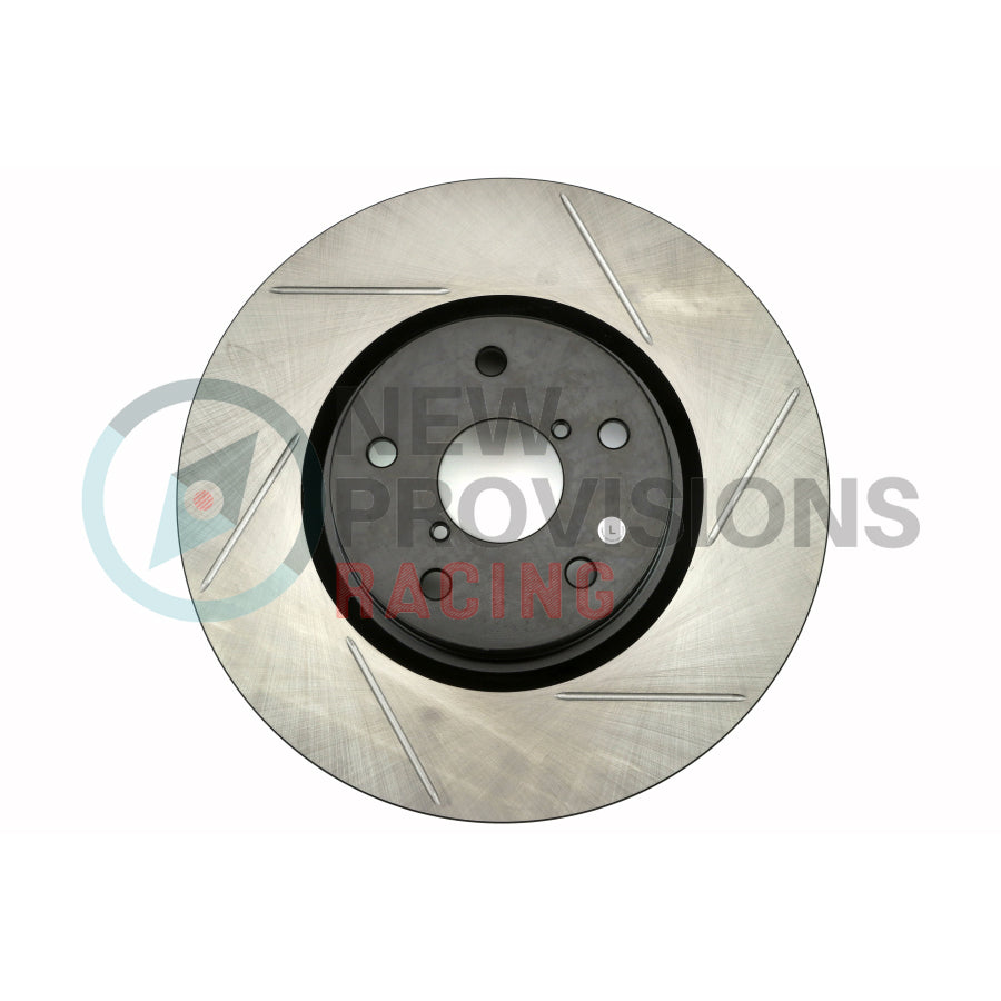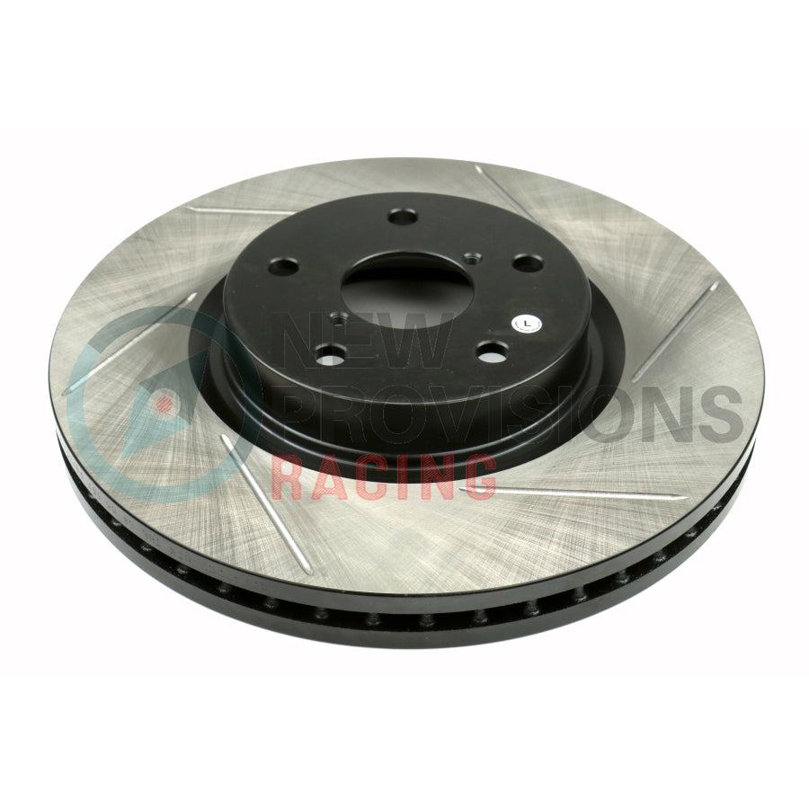 The Stoptech Slotted Brake Rotors are a great OEM replacement, and will improve the braking performance in your vehicle ffrom daily driving activities, to high-performance driving. The slots on the rotor create a sweeping motion to wipe the surface of the brake rotor clean from brake dust, to hot gasses generated from extreme braking which improves cooling, and provides more of a bite under braking.