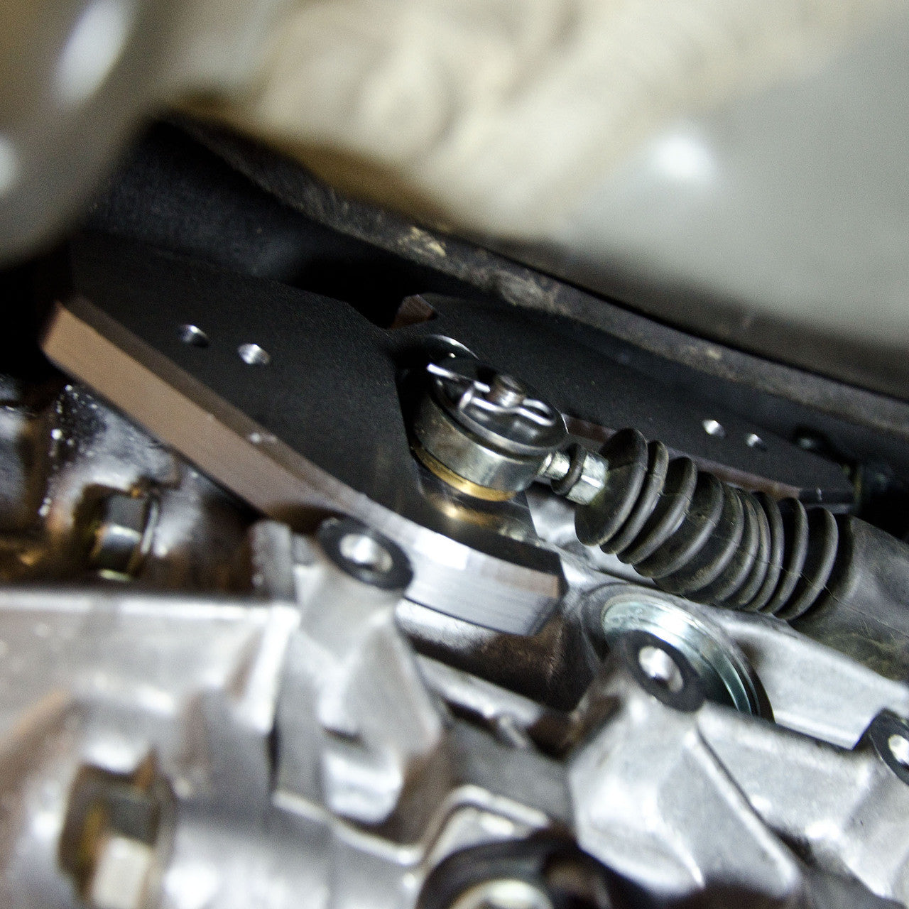 This is the Boomba Racing Short Shift Transmission Plate. This is an extremely durable bracket that has been fabricated from zinc-plated steel. This is a direct replacement of the existing shift plate on the passenger side of your transmission which can reduce your shifter throws by 30% or 50% when paired with Boomba's short throw shift lever. This particular plate has an increased weight of 1340 grams which is nearly double the weight of the stock plate which will help shifting momentum and positive engagement.